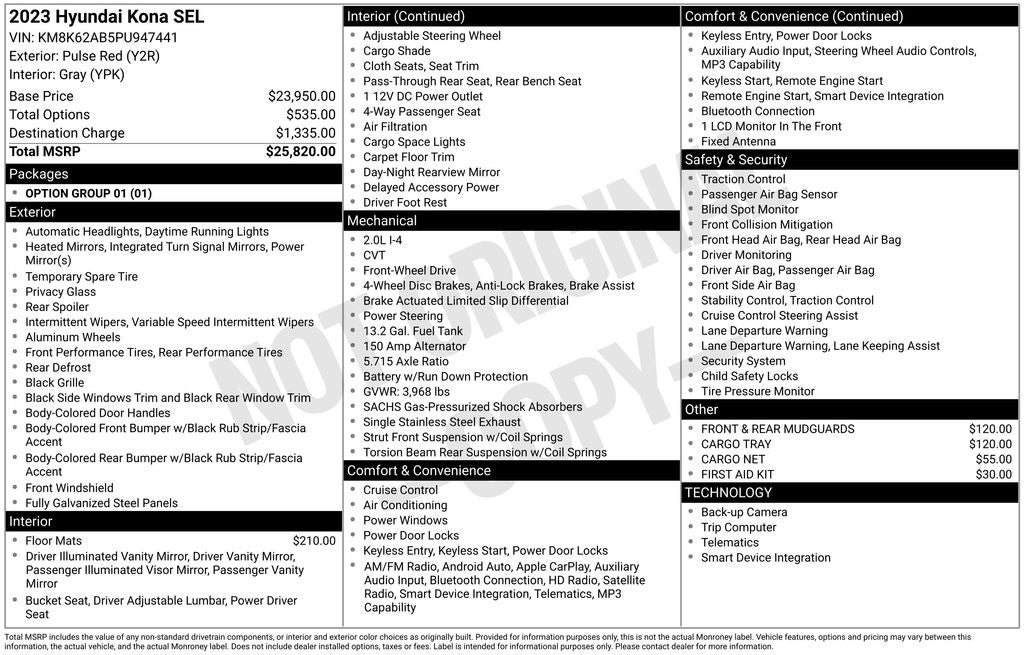 Beneath the sleek exterior, the Kona SEL is powered by a 2.0L I4 DOHC Dual CVVT engine, delivering a responsive and efficient performance with an EPA-estimated 30 city/35 highway MPG. The seamless CVT transmission ensures a smooth, effortless ride, while the front-wheel-drive configuration provides confident handling in a variety of road conditions.