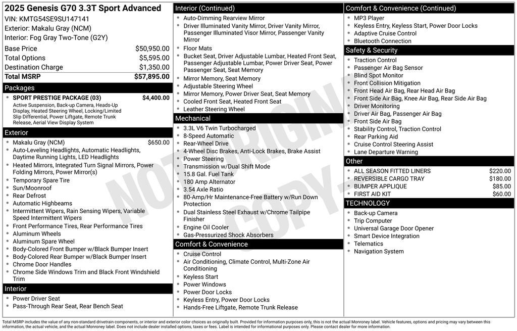The 2025 Genesis G70 3.3T Sport Advanced is a true testament to the brand's commitment to exceptional craftsmanship and innovation. With its advanced safety features, premium amenities, and stunning design, this vehicle is poised to exceed your expectations. Experience the difference for yourself and schedule a test drive today.